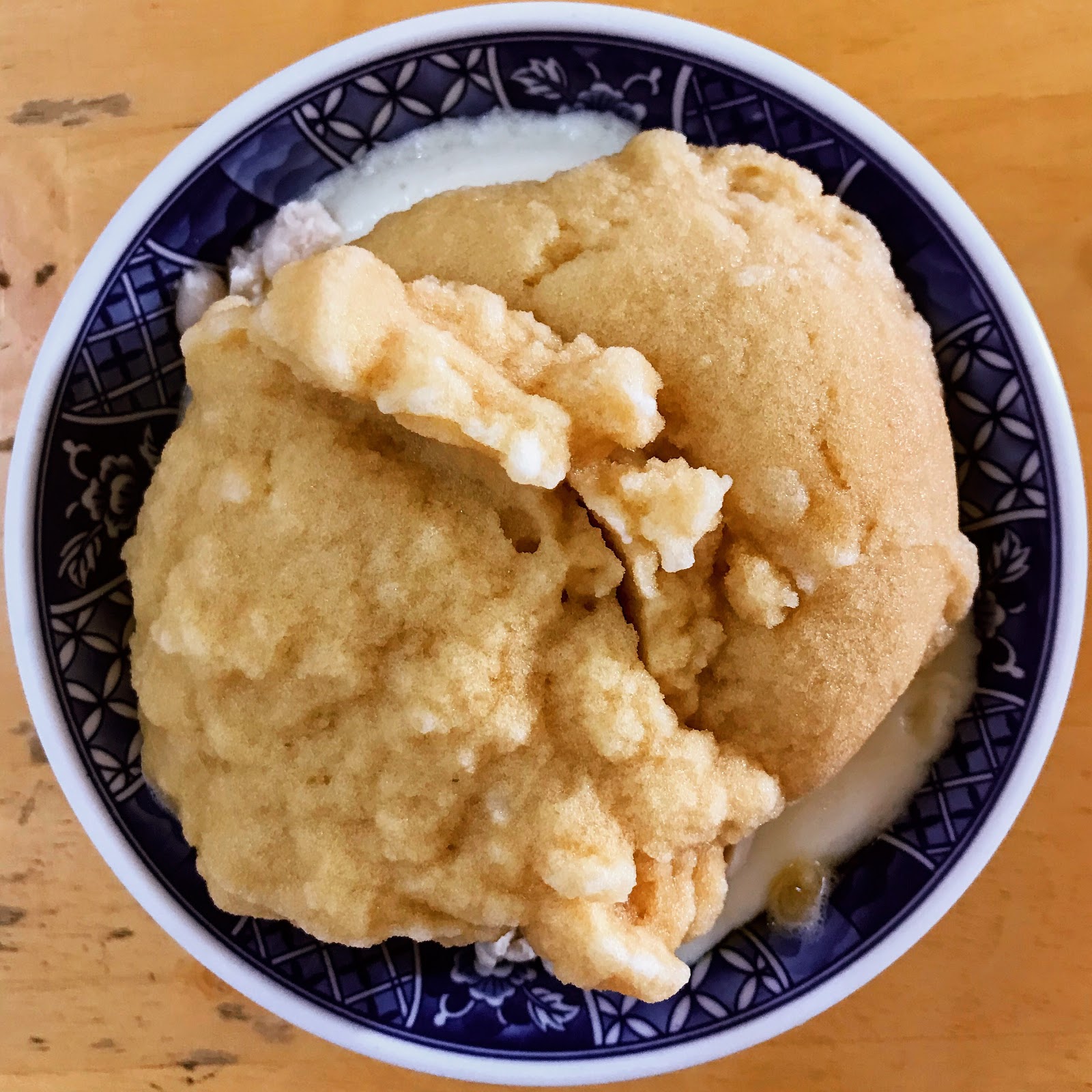 這天點的是台灣最常見的花生豆花,不過這樣貌倒不大一樣,乍看很像乾的版本,其實是把糖水的部分做成了冰沙,而且阿姨的個性也特別豪邁,用杯子一口氣撈了一大杯冰沙,幾乎要比豆花份量還多,更像是吃有配料的綿綿冰。至於豆花本身就是綿軟型又頗具豆香,中規中矩但還不賴,唯獨花生稍嫌脆硬了點,口感略顯突兀,可能選其他配料會好些。