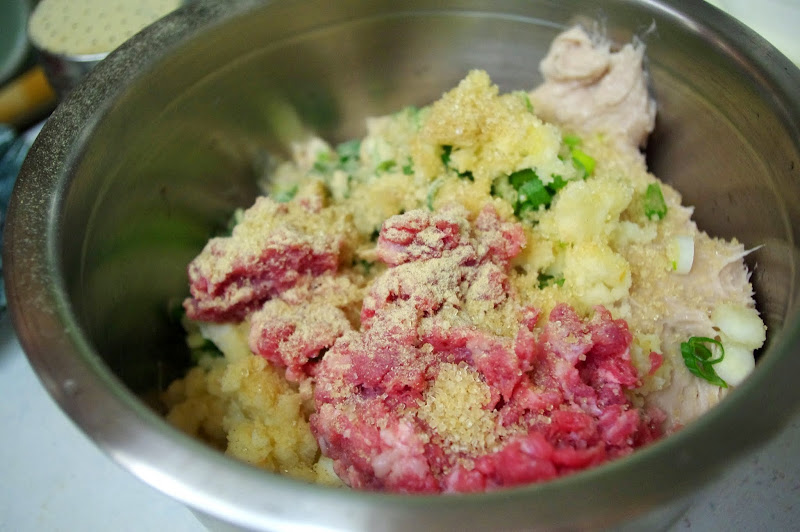 2. 將荸薺用塑膠袋裝起來以棍棒敲碎,再將魚漿、蔥花、荸薺和絞肉放在鍋裡,依序加入糖和白胡椒稍稍調味後,以手掐捏混合均勻。