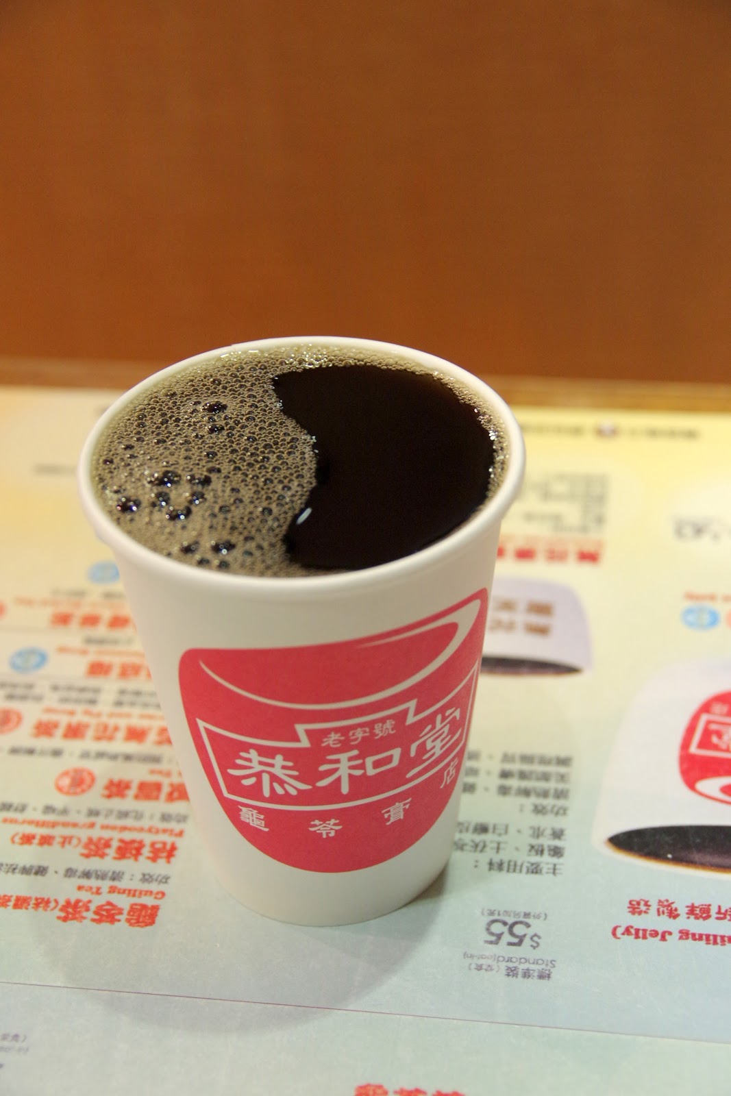 到香港時由於吃得多又幾天睡得比較少,所以也想吃點龜苓膏或涼茶來清熱解毒一下,之前吃過老字號恭和堂的品項,因此這次就又來造訪了。龜苓膏可以選熱燙的跟凍的,而一般個人會選熱的,一來熱燙時苦味較不顯且對身體較好,二來是熱燙時還仍舊維持形狀的龜苓膏,就不太會是坊間以仙草粉或吉利丁製作的非正宗品。