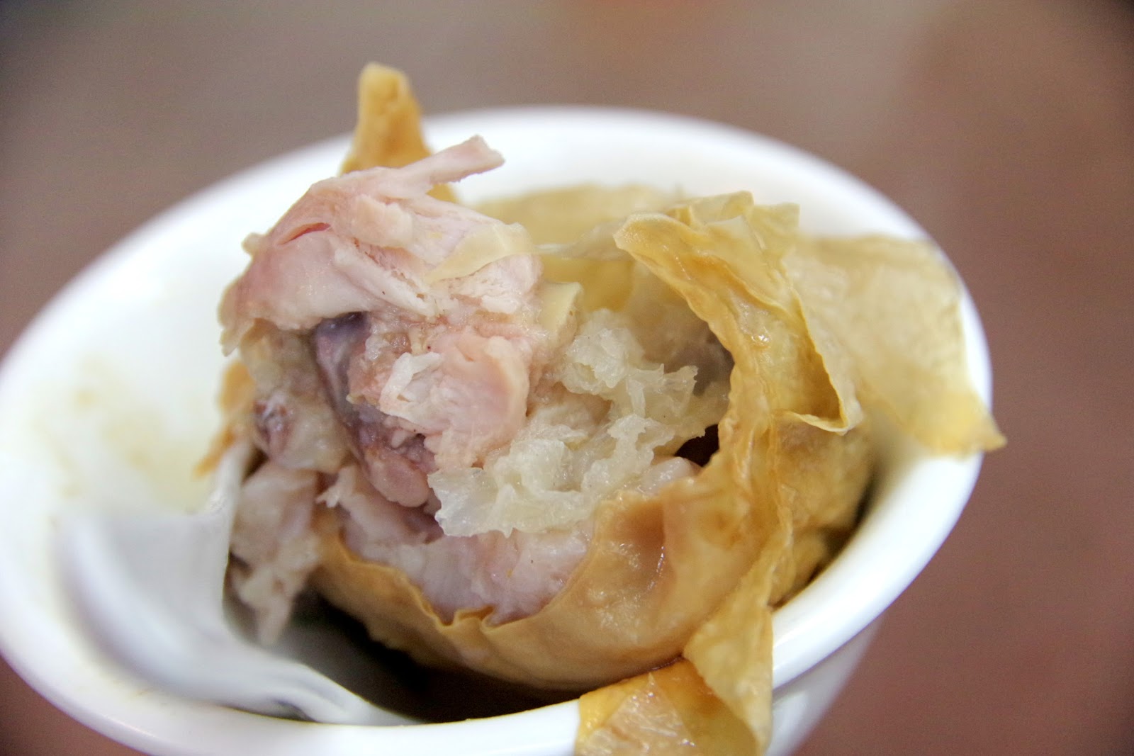 再來非常推薦這裡的雞扎,也幾乎可以發現每桌都有點,甚至有的在地人才剛點完茶就急著問有沒有雞扎,可見在這裡的熱門程度。雞扎原則上是以腐皮包裹住雞肉、魚肚和冬菇後拿去蒸,最迷人的就是那塊魚肚,口感酷似台灣的爆豬皮但油氣沒那麼重,吸了滿滿的湯汁與冬菇鮮,入口就能嚐到飽滿的鮮味層次,配上炸腐皮的硬彈增添口感,即便雞肉不是重點卻也相當好吃,而另外還有鴨腳扎就是把雞肉換鴨掌,其實重點都會是那塊吸滿湯汁的魚肚。而棉花雞其實內餡跟雞扎頗像,多了豬肉就是了。