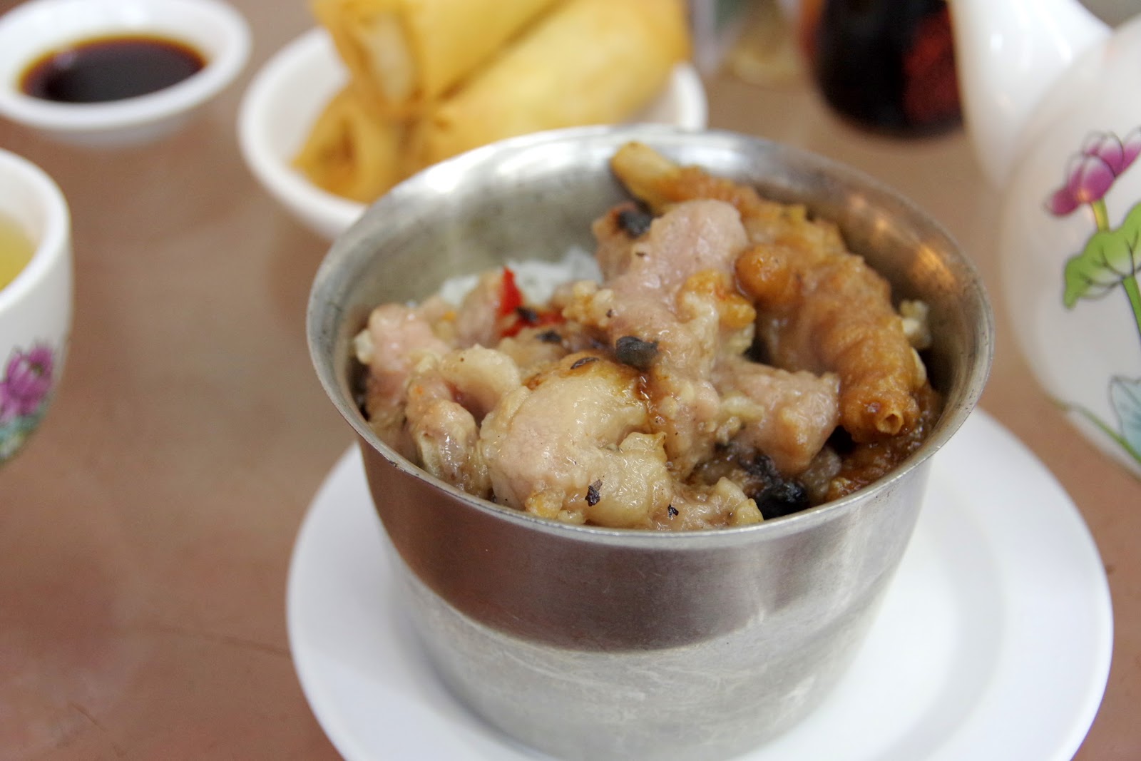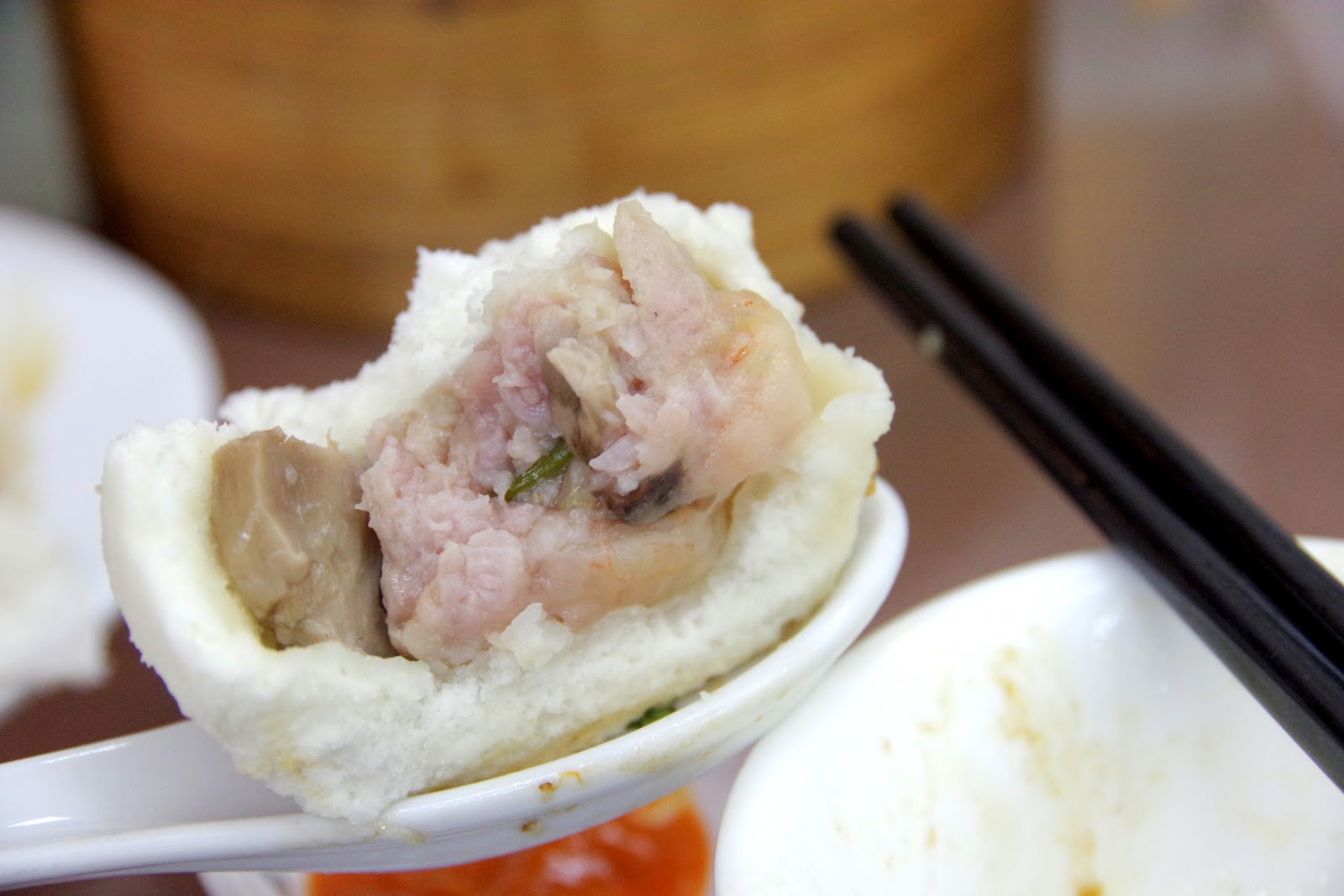 這裡推薦先點一碗蒸飯填填肚子,鳳爪排骨飯就還不錯,排骨的軟筋好咬且豆豉調味到位,鳳爪其實沒到那麼軟嫩但還算好剔,應該說調味很舒服所以就很不錯。而另外想吃飽的話也可以選叉燒包或菇粒雞包仔,包子皮的溼度跟香氣很理想,且裡頭的餡料肉汁也很夠,所以不會像坊間那種放久了的會太乾,可以點一籠試試。