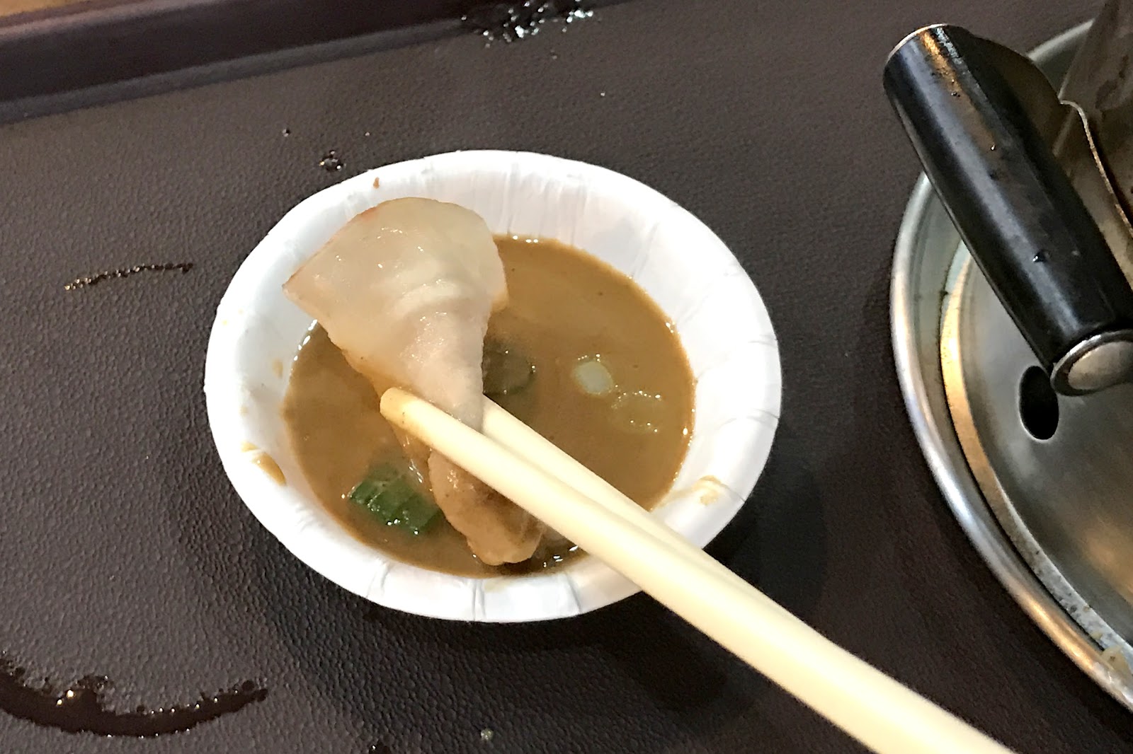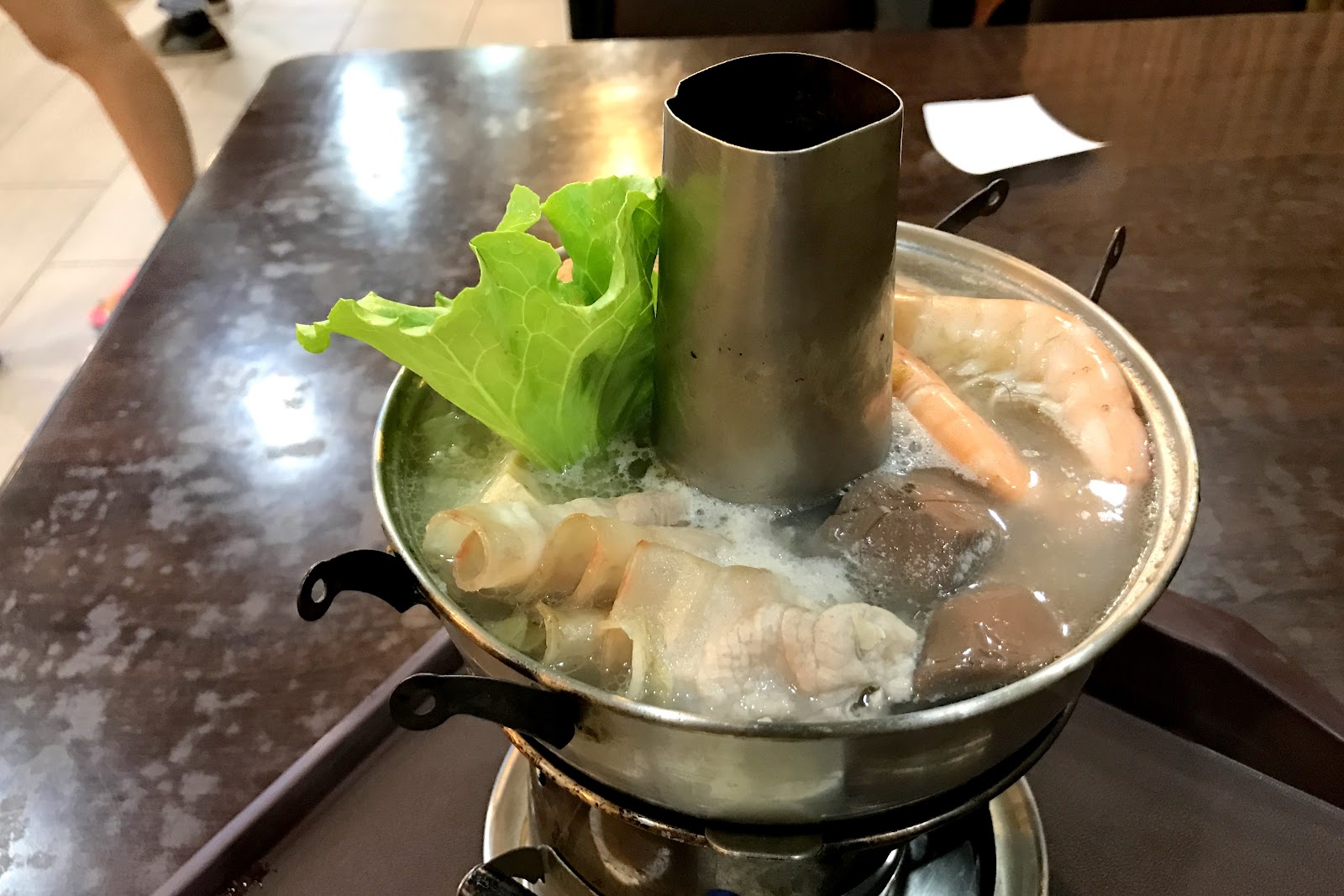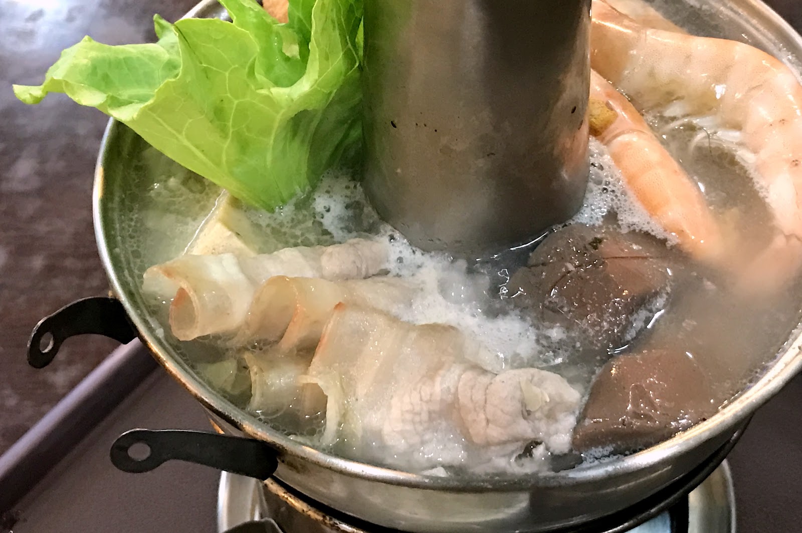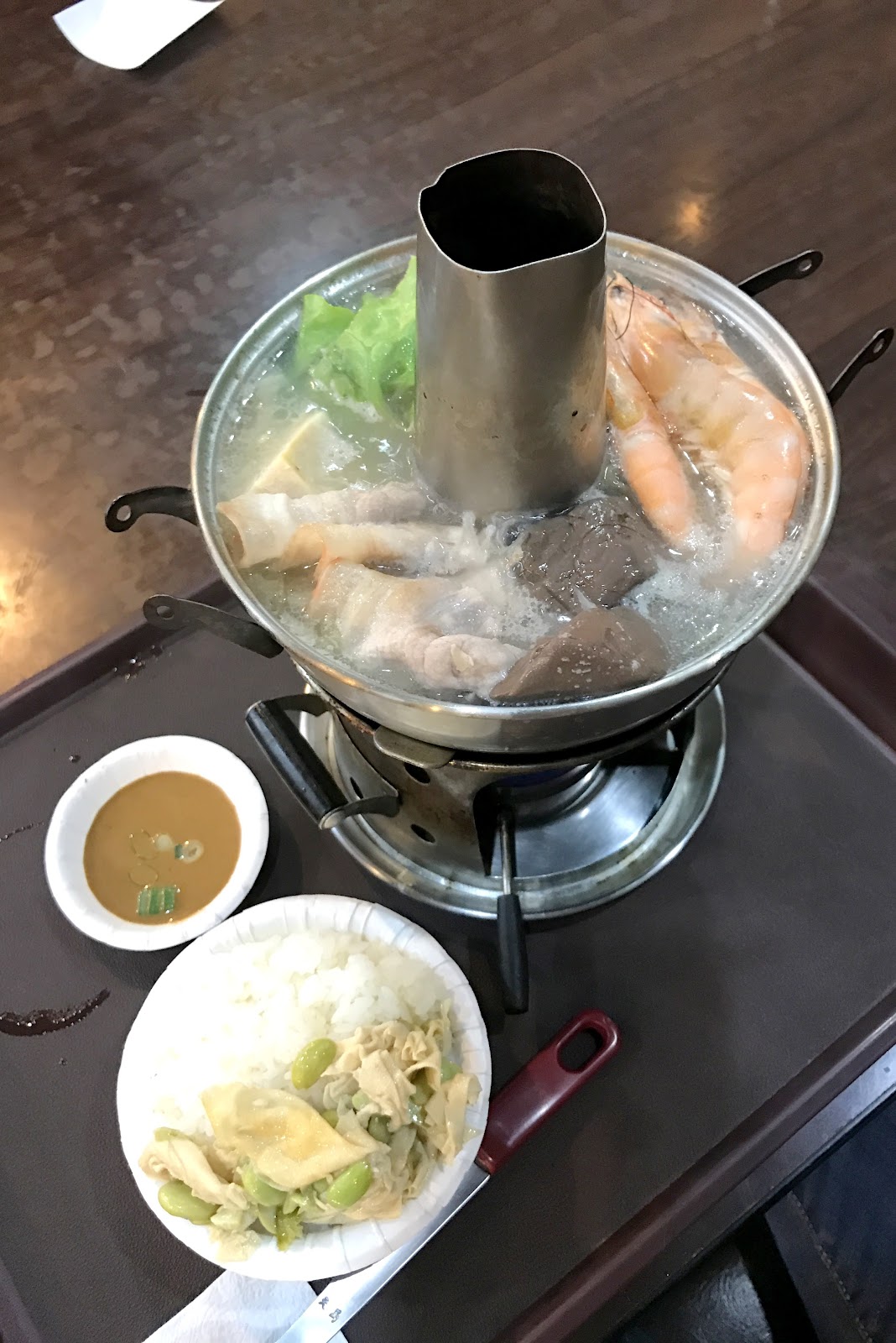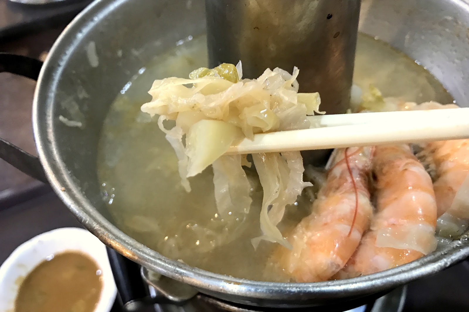 一份兩百的酸菜白肉鍋其實要價不算貴,裡頭的料比我想像中還豐富,除了基本的白肉跟酸菜,還放了蝦子、肉丸、豆皮、凍豆腐、鴨血跟金針菇,而沒有放任何廉價火鍋料這點個人覺得蠻重要的,那些料不僅廉價也跟酸菜白肉不搭。湯頭來說一開始味道有點淡,不過後面酸白菜的味道煨滾出來後就很夠味。白肉的肥瘦比例頗理想,不會過油而顯得無口感,皮脂的彈性尤其好吃,蘸點一旁的麻醬與醋會滋味更豐富。唯一的小缺點就是這個小煙囪鍋的造型,當湯喝到只剩下兩成的時候湯匙就很難撈了,且一開始冷鍋時加熱較慢,要等到滾燙而可以吃的程度需要大約十分鐘,不過整體來說還是不錯的,若一個人嘴饞想吃酸菜白肉鍋的話不妨來這試試。