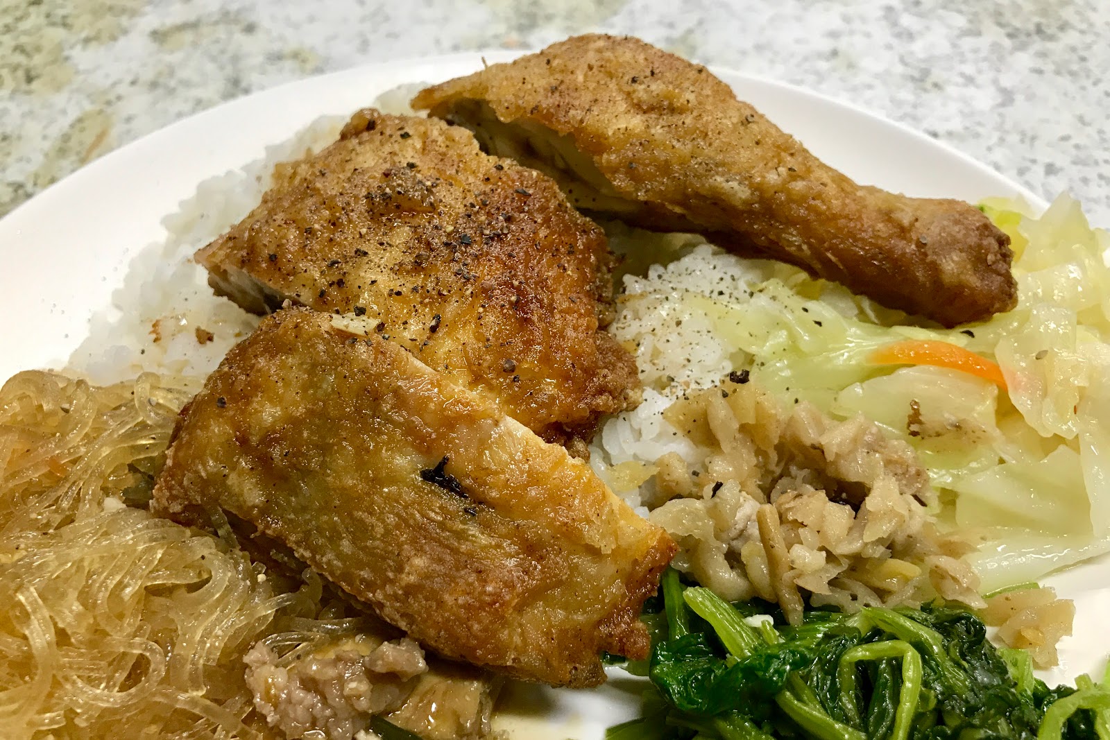 雞腿來說火候掌握得很好,腿肉中蘊含了相當豐富的肉汁,且雞皮也蠻酥香的,算是好吃的炸雞腿,只是這天的雞腿稍微薄了點,所以顯得調味較重,又加上放了一陣子所以油膩感也突顯上來。感覺問題都是在於不是現炸起鍋後盛盤,不然確實是好吃的品項呢。