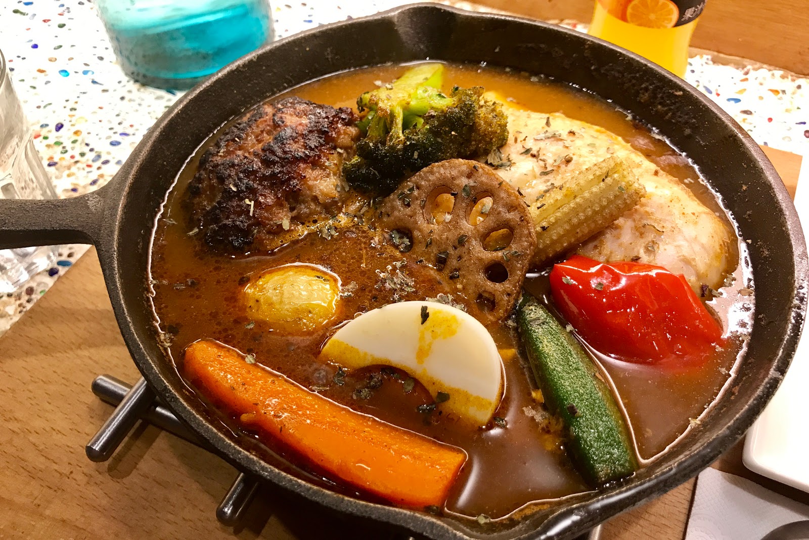 這裡的菜單多半是一種肉類再搭配幾項綜合蔬菜,不過由於鐵鍋較寬的關係,單只一道主菜的話看起來會比較空,所以這天除了漢堡排以外還加點了雞腿,整個才顯得多樣又豐富許多。湯頭來說就是咖哩的香氣很足夠,不過入口卻帶著高湯的鮮度跟厚度,雖然是咖哩卻有著滑順的口感,單喝就能感受到最直接的香氣,配飯時建議以湯匙挖一點飯去沾咖哩汁來吃,不然澆在飯上不僅不方便吃,且會搞得像湯飯那般糊爛口感不佳。