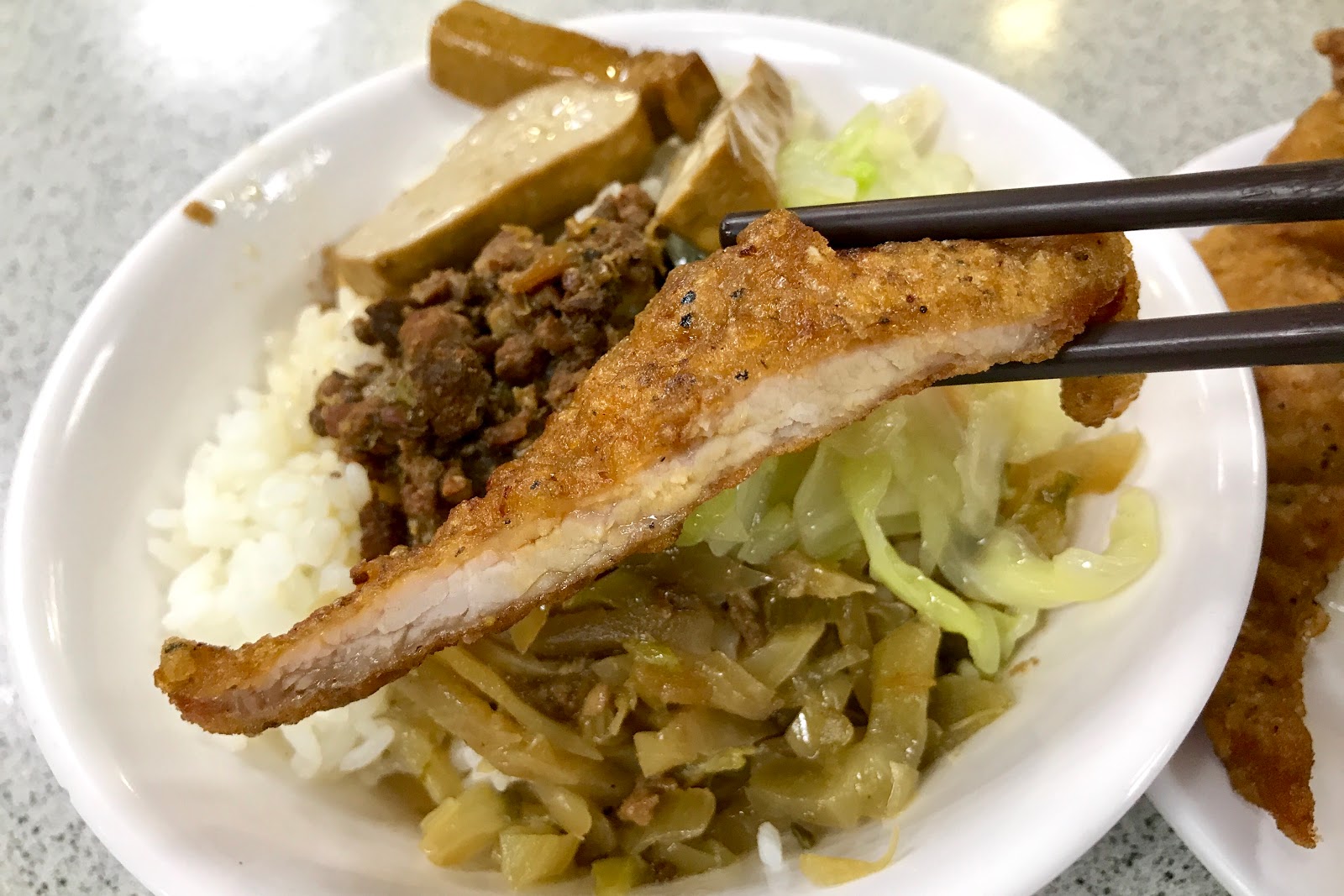 金園的排骨飯也是分開裝的,排骨本身炸得金黃酥脆外還帶點醬色,麵衣已經有味道所以直接吃就很好吃,比較明顯的缺失是厚薄實在不均,因此炸出來的肉感不太一致,薄的地方雖不到汁嫩但絕對不柴澀,而好吃的是靠近骨頭厚的部位,醬味足又有豐富的肉汁,肉質嚼彈讓人想多啃幾下,是台灣人很能接受的風味真的是香啊。