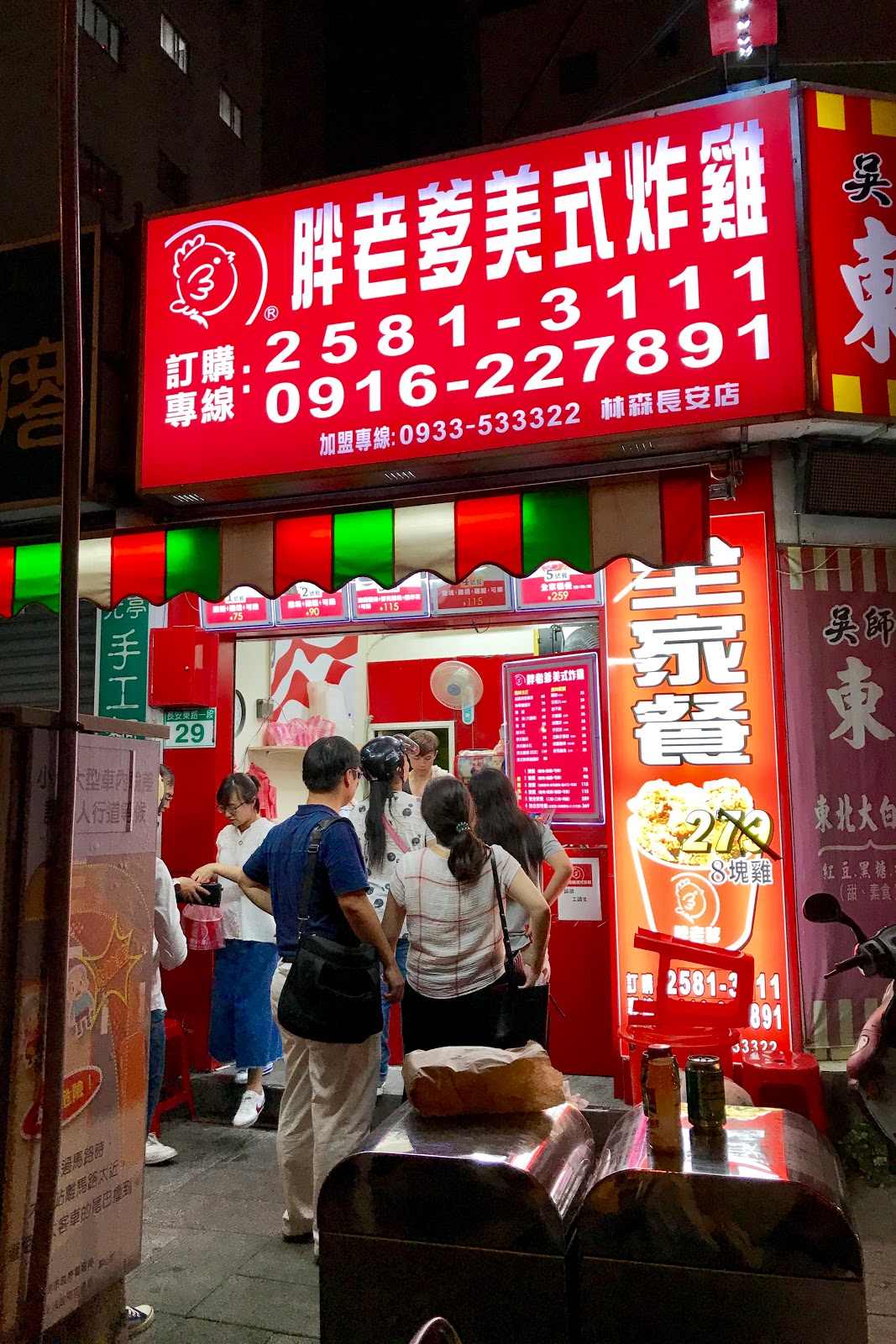 第一次造訪時是平日晚上的8:50,本來看店門口只有兩組客人在排想說應該可以買到,看了菜單研究了一堆想試的品項,結果到我們的時候告知要等到9:30以後,不論是雞塊、香雞排還是花枝丸,通通都要等40分鐘以上,只有店員眼前已經炸好的雞腿跟雞翅可以立刻帶走,因此第二次選購時就改為五點先打電話去訂,然後六點半後再去拿會比較省時間。