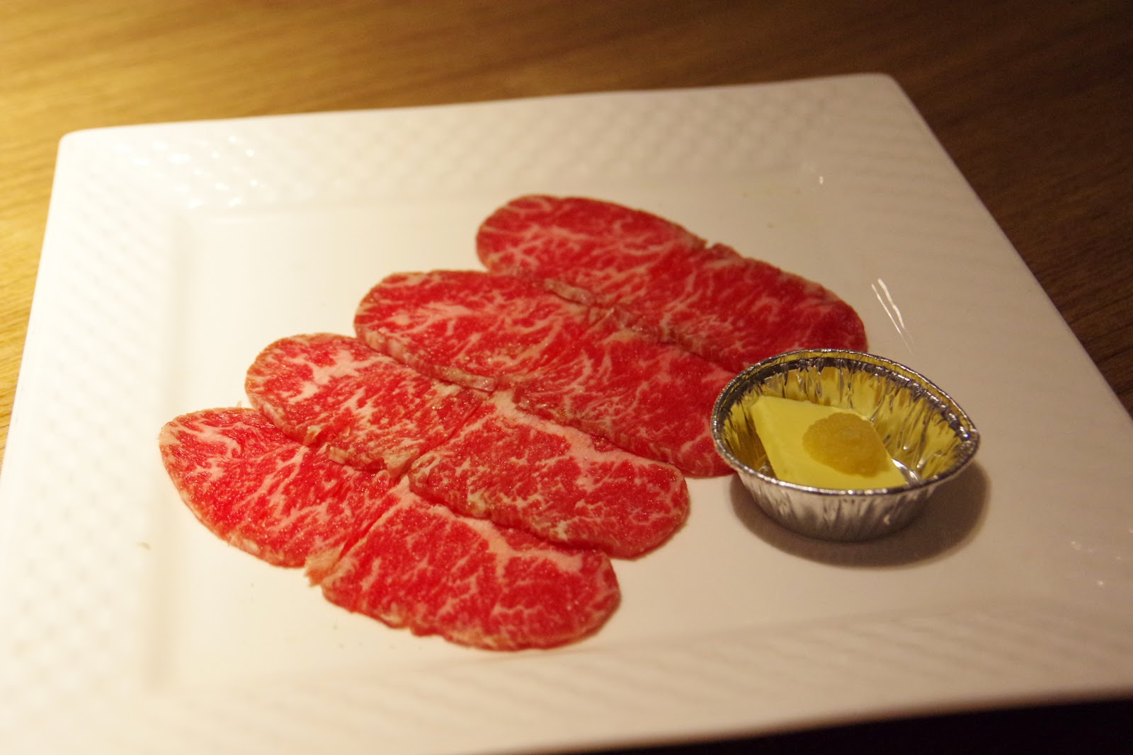 相較之下店家推薦的特價品─嫩肩牛小排就較差強人意,中文不太容易知道是哪個部位,看日文才比較知道是みすじ三筋,約莫是前腿與肩胛骨後方的稀少部位,理論上霜降油脂特別豐富,烤到半生熟是最好不過,但這天的份量實在過薄過少,不僅燒烤起來特別容易黏網破碎,也不容易吃出它潤澤的口感,此外一旁附的蒜泥奶油也稍嫌多餘,奶油香氣過重也過於油膩,個人偏好配蔥花跟昆布鹽享用,但說實話還是拿去換別盤的好,多一盤伊比利豬也比較贏。