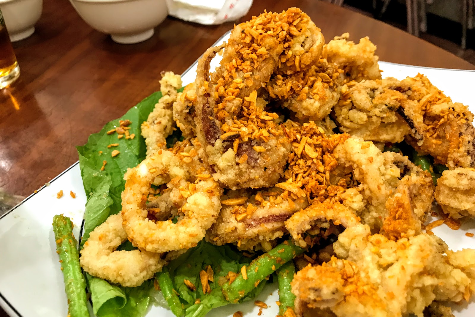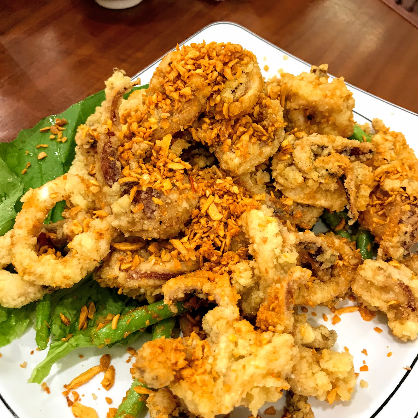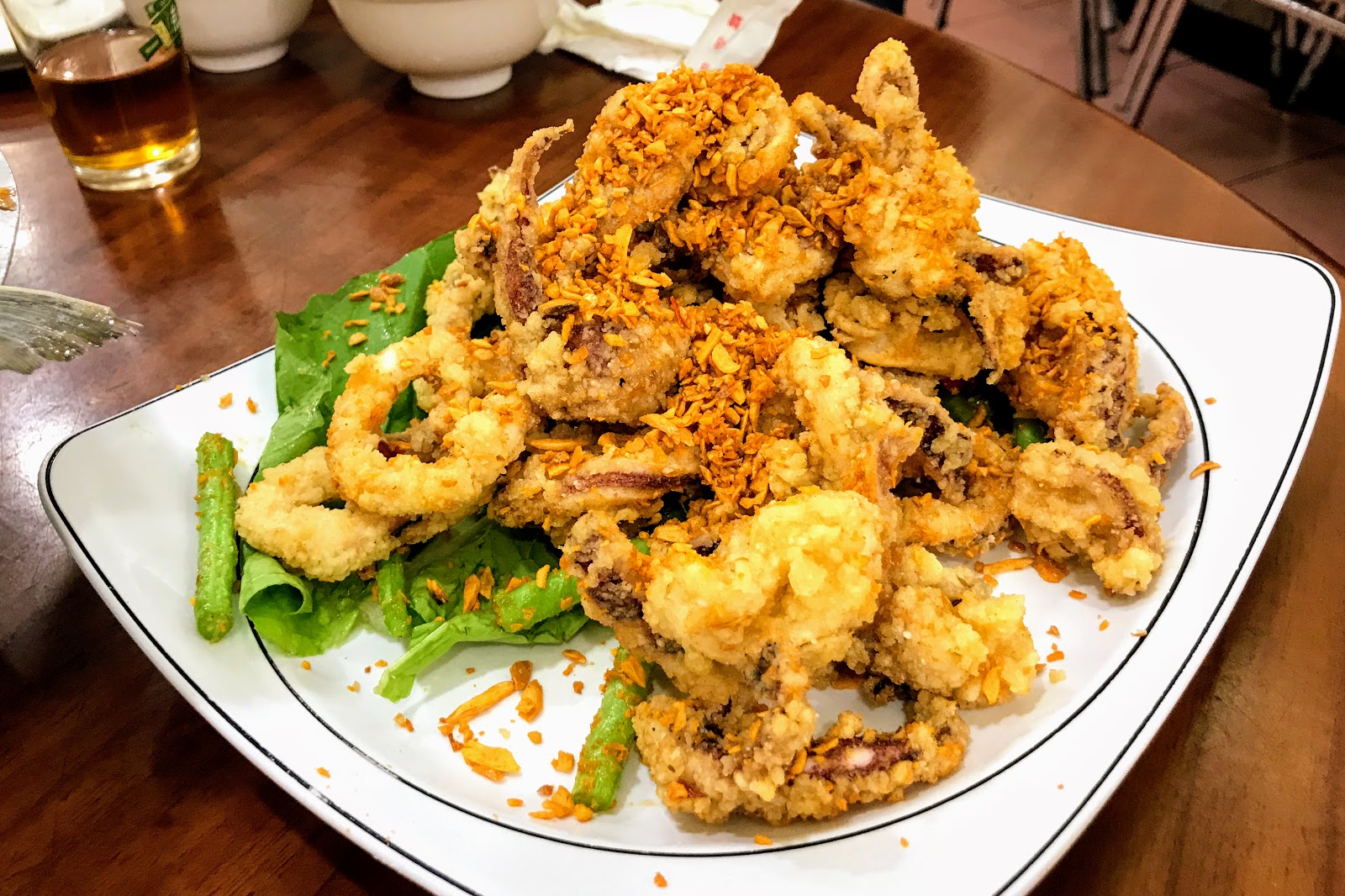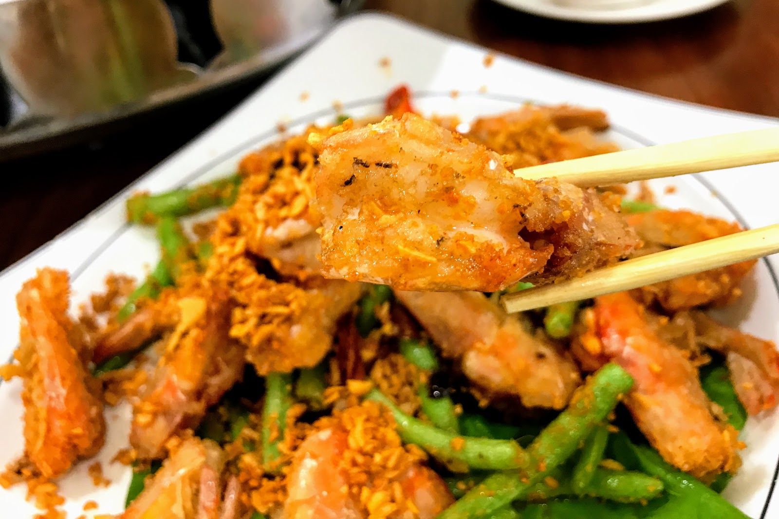 再來推他們家的避風塘中卷,同樣上桌也是硬漢料理的份量,中卷切成肥圈炸得硬殼酥脆,帶上開胃的蒜酥香氣,舌觸也不帶多餘的殘油十分乾香,建議四五人分食著比較剛好,確實好吃推薦。而避風塘炒蝦也很不錯,蝦身肥厚開背更顯彈脆,扎嘴的刺鬚也都修剪了乾淨,連殼吃也方便好嚼。這兩者也都特別好巴醬汁,拿豆瓣魚的醬料淋上也是美味。