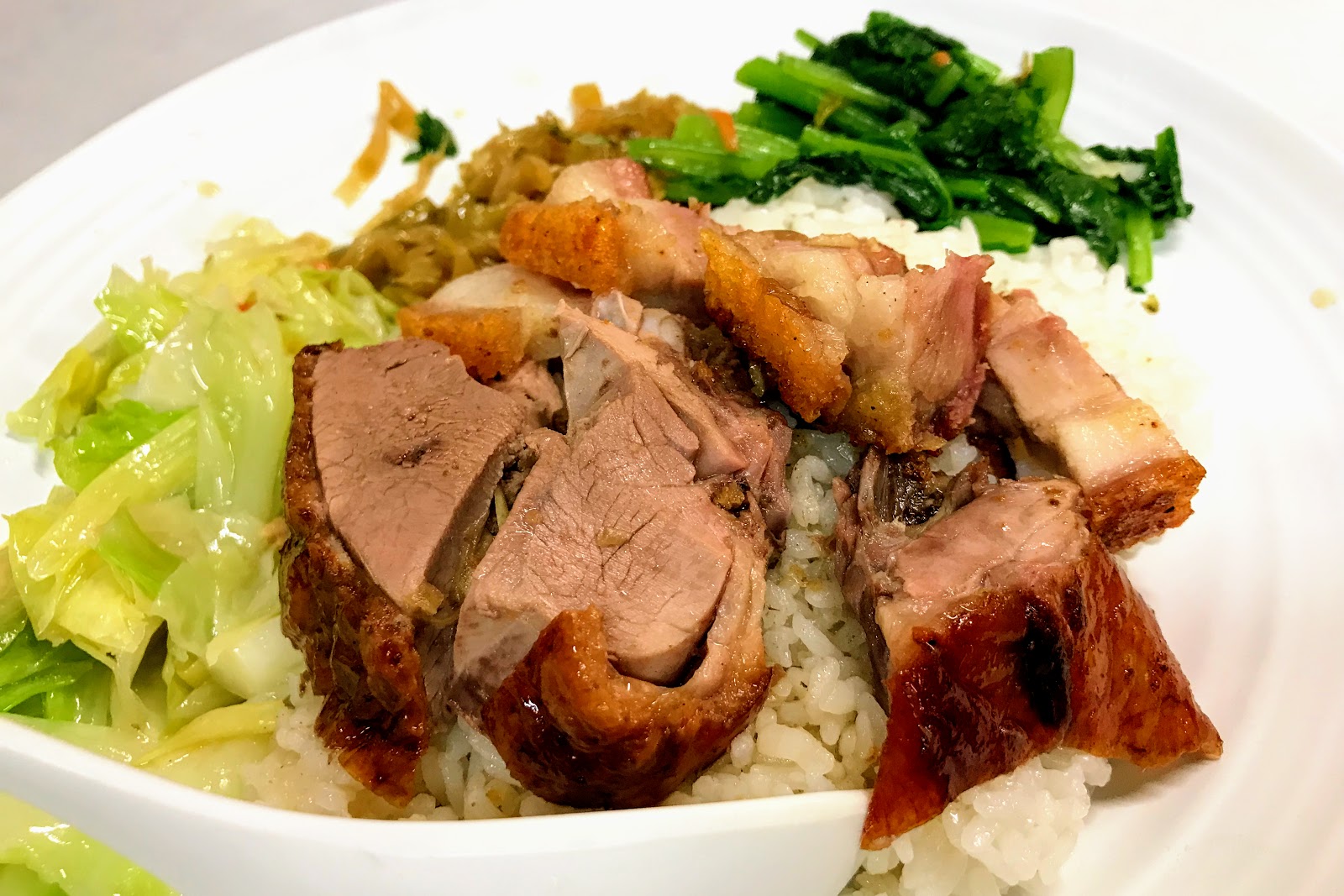 招牌的烤鵝就單點來說1/4只要450還算可以接受,但最平民的選擇還是點烤鵝飯,甜度跟肉質纖維都有比烤鴨要顯著的提升,醬汁搭了鵝汁所以鮮味足又不膩,澆在飯上胃口特別好,而要是運氣好一點趕上開鵝的好時候,更別錯過他們家鵝腿飯,雖然只有半隻腿的份量,但總和算起來跟香港比較還是很划算,品質又有一定水準很推薦。