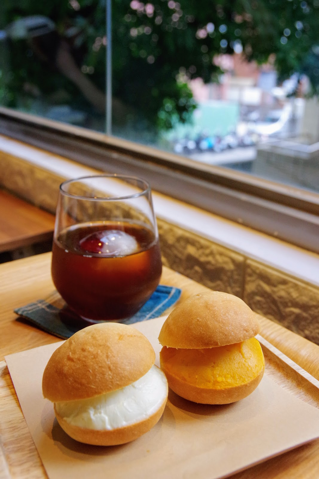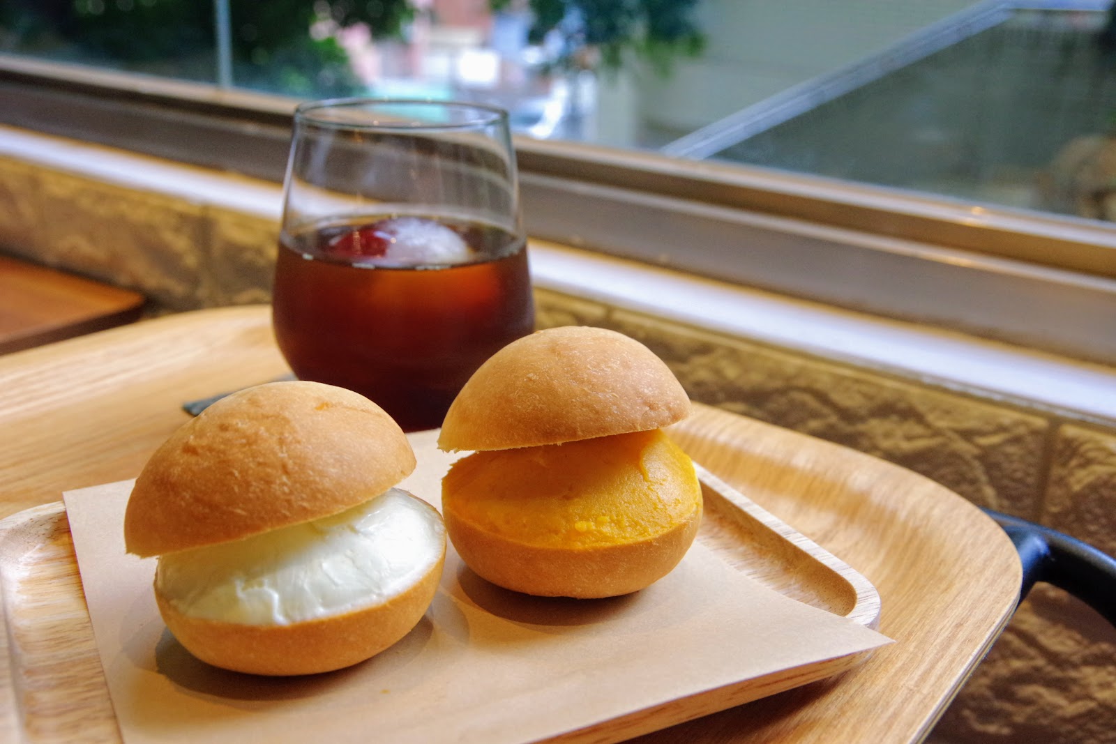 過程中有看到許多桌客人都點了圓麵包或生吐司,這些麵包據說都是他們家自己做的,選了蠻可愛的小圓麵包,一份共有兩顆,個頭約莫拳頭大小,且抹上了一小山的Cream Cheese跟地瓜泥,份量還蠻夠的。主要是這圓麵包其實相當Q彈,有著像是饅頭那般地扎實彈性,卻又帶著烤過乾爽的麵香,配上地瓜泥或起司都不壞,而且地瓜泥也蠻綿密香甜的。只是吃的時候不建議當三明治夾起來吃,麵包太有彈性的結果就是餡料很不受控,建議是拆開分成兩片抹醬厚片,既方便吃,口感也會比較剛好。